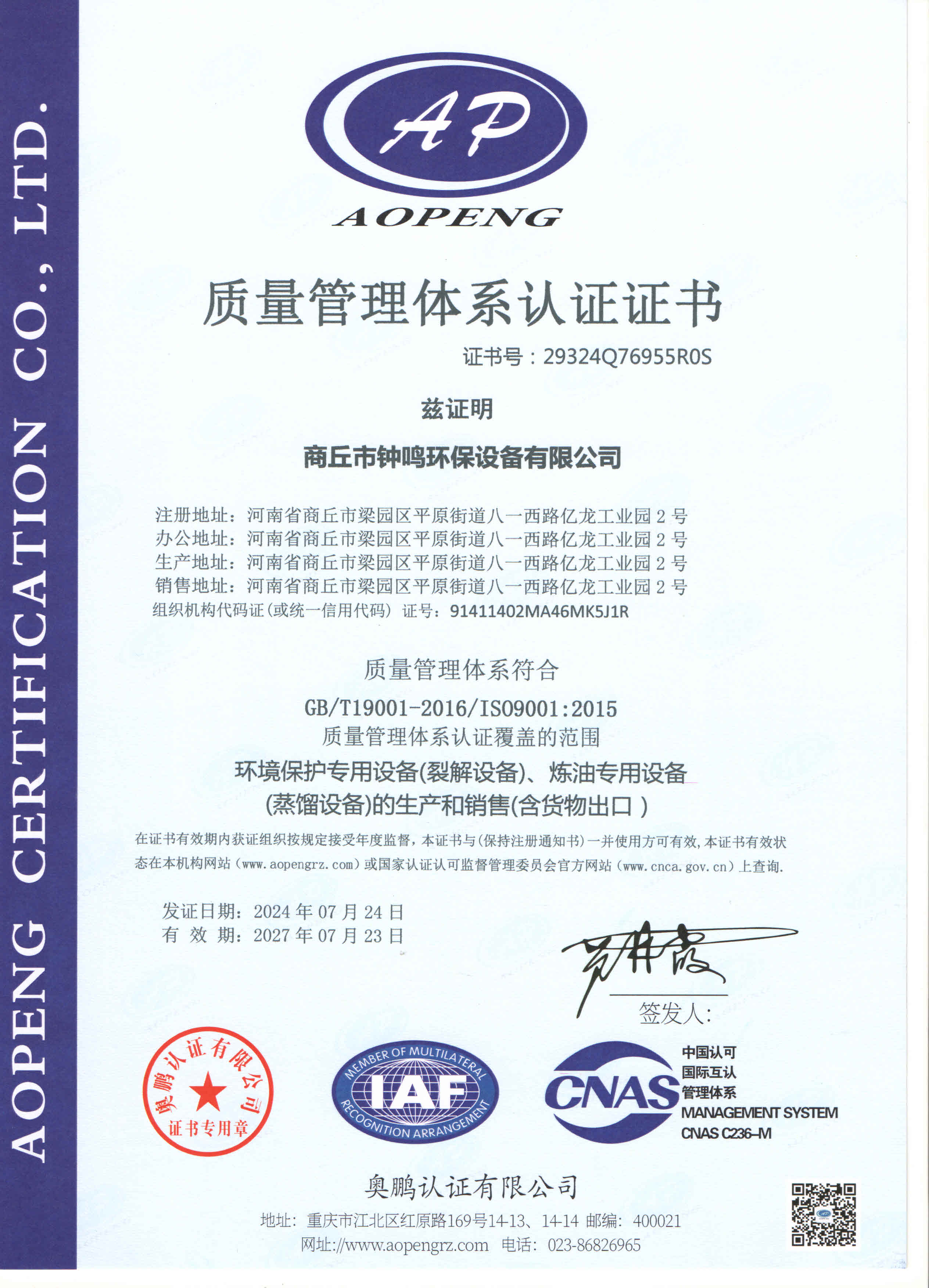 質量管理體系認證證書